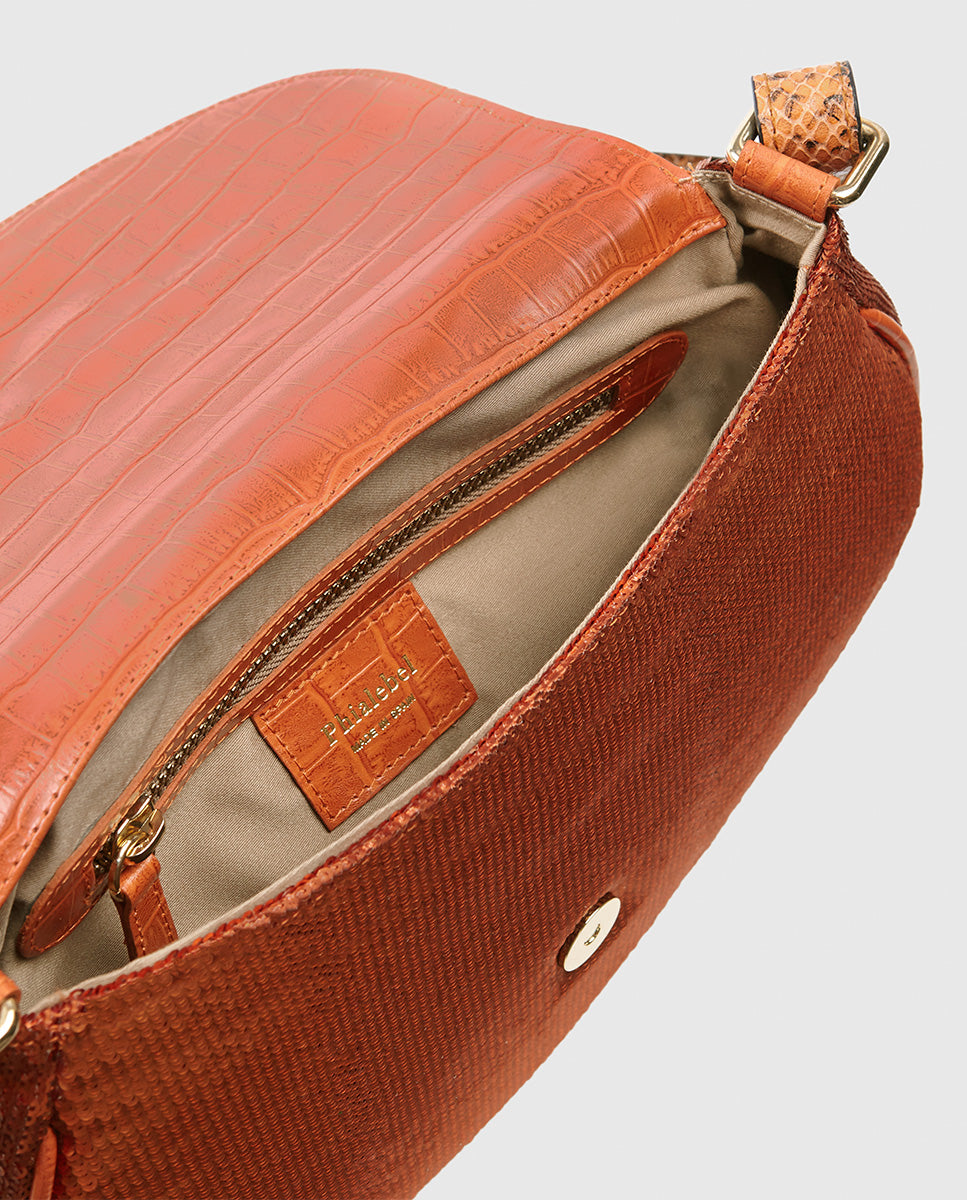 - Adjustable shoulder strap and inner flap in orange embossed mock croc finish leather