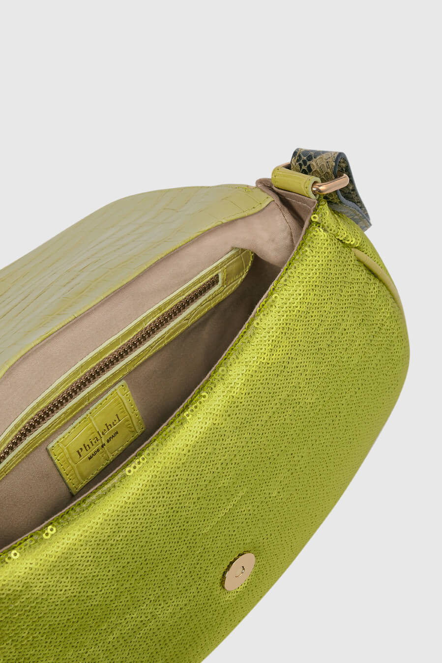 - Adjustable shoulder strap and interior flap in green embossed mock croc finish leather