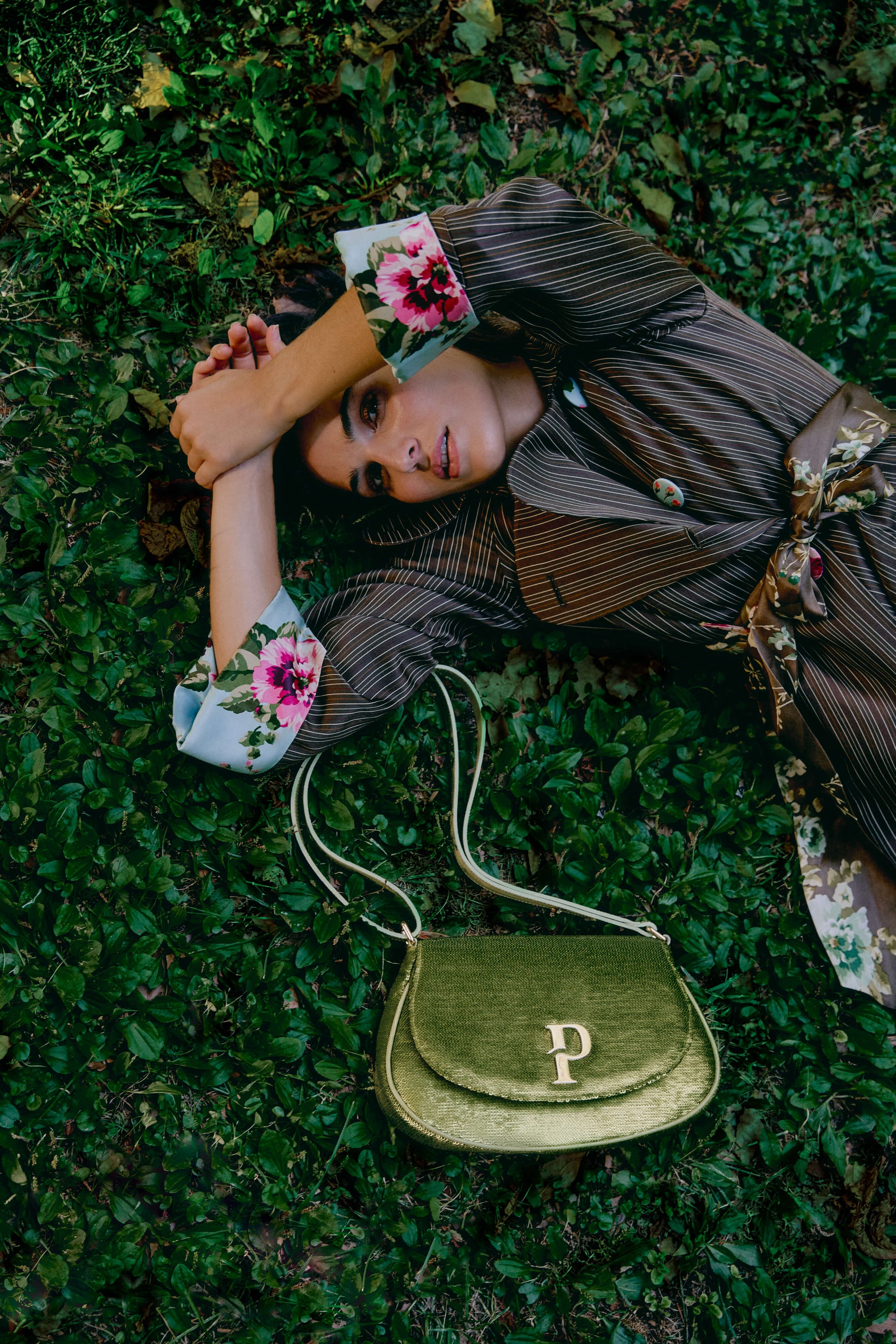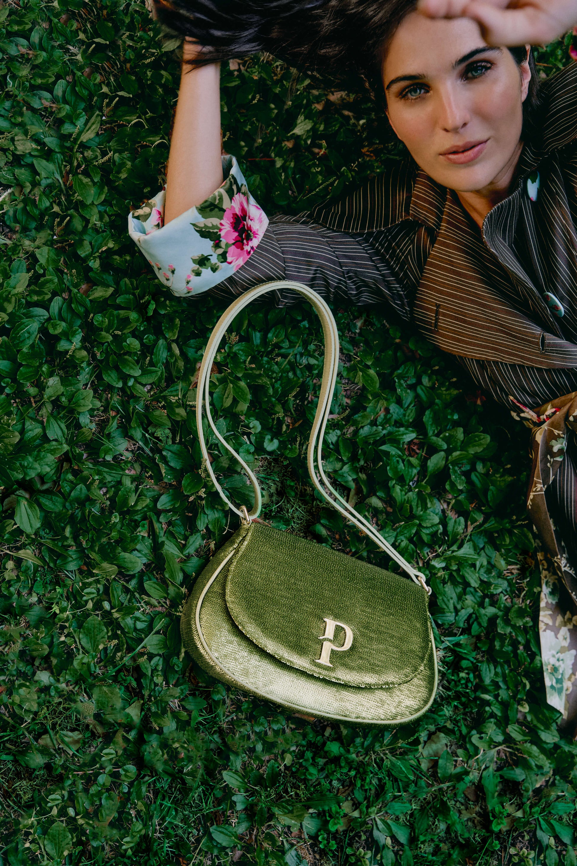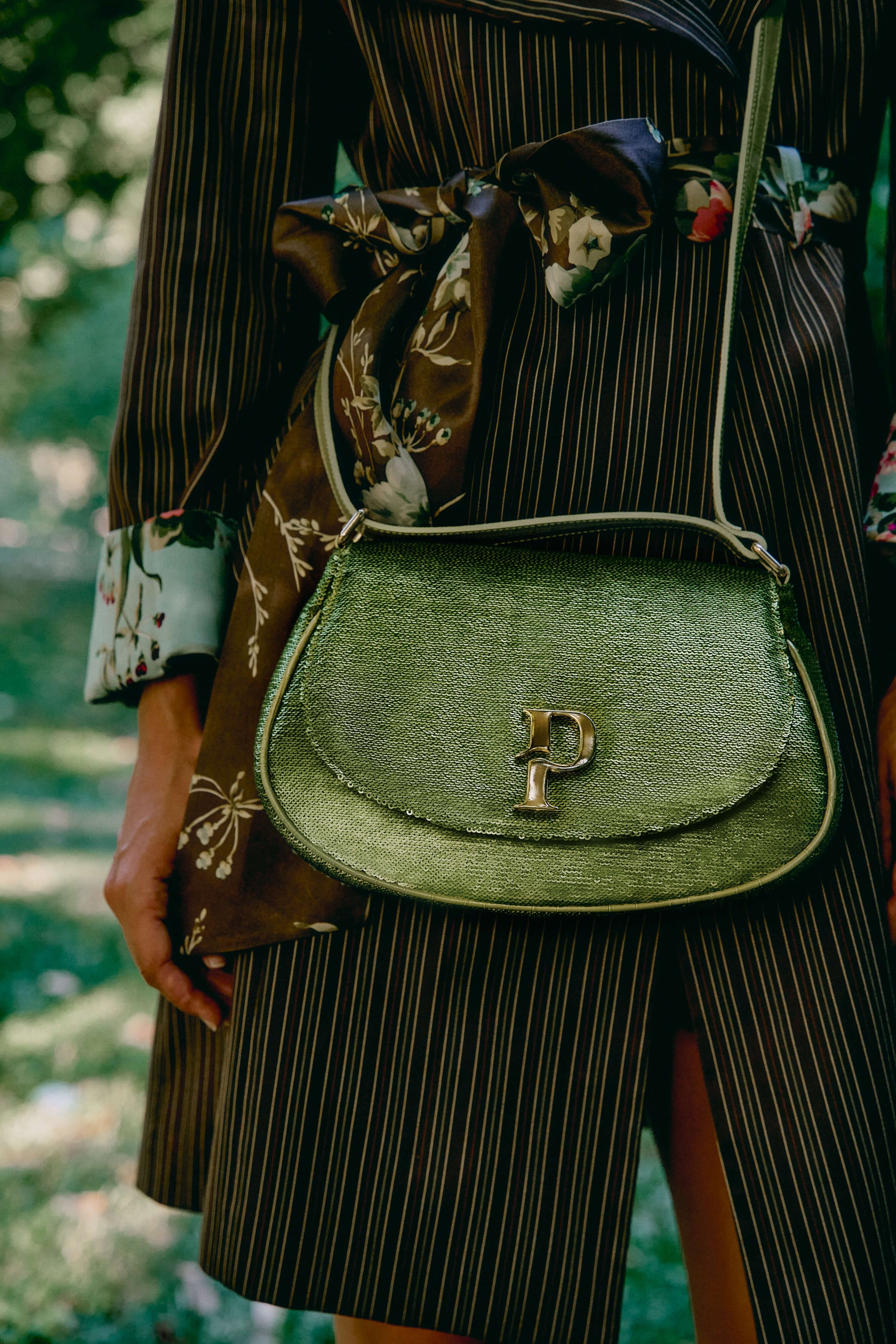 Paula hobo bag made of green sequins decorated with our P signature logo in gold finish. The bag can be worn either on the shoulder or cross-body.