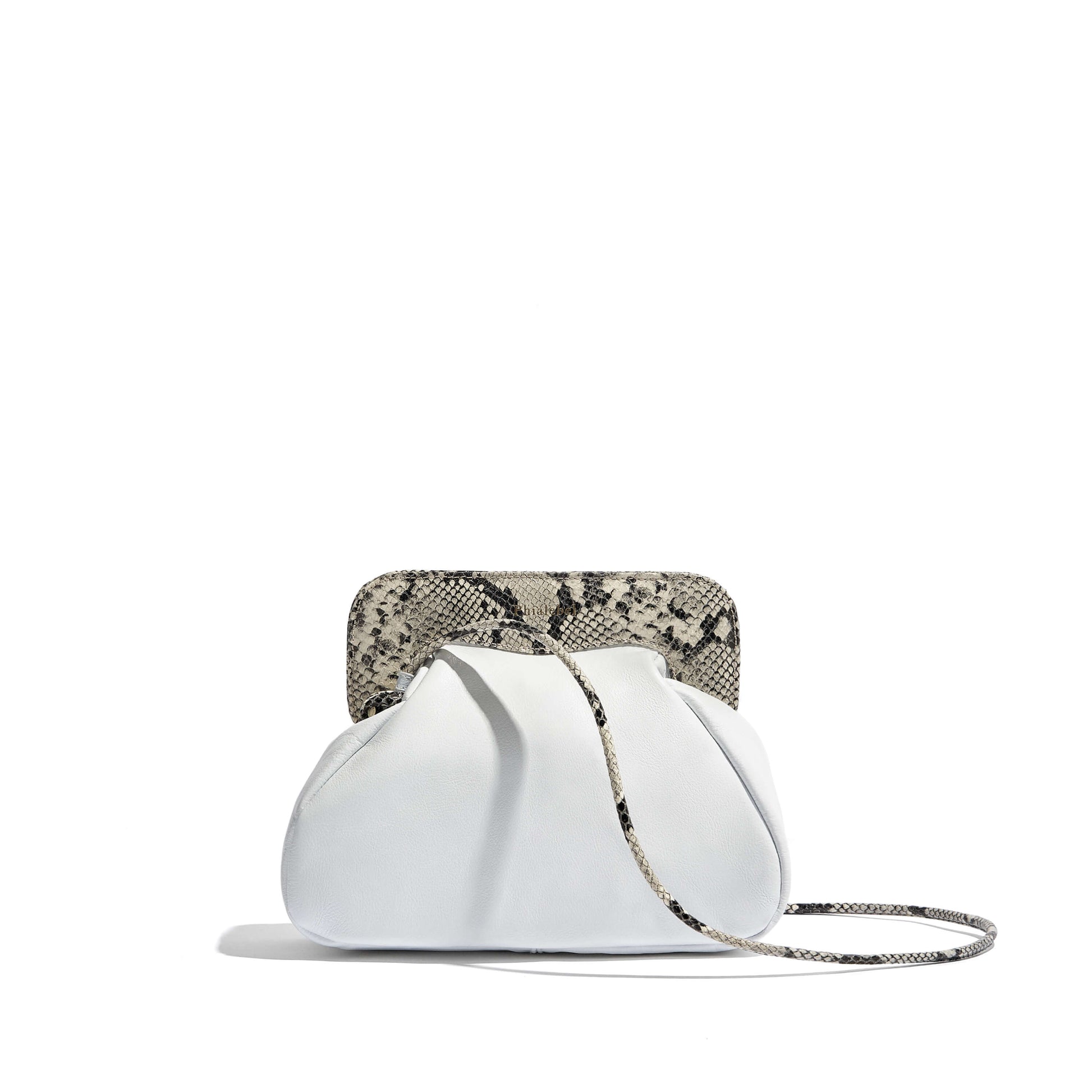 Bolso blanco con solapa snake-print, de napa con un diseño femenino y versátil, con el logotipo de Phialebel en la solapa.