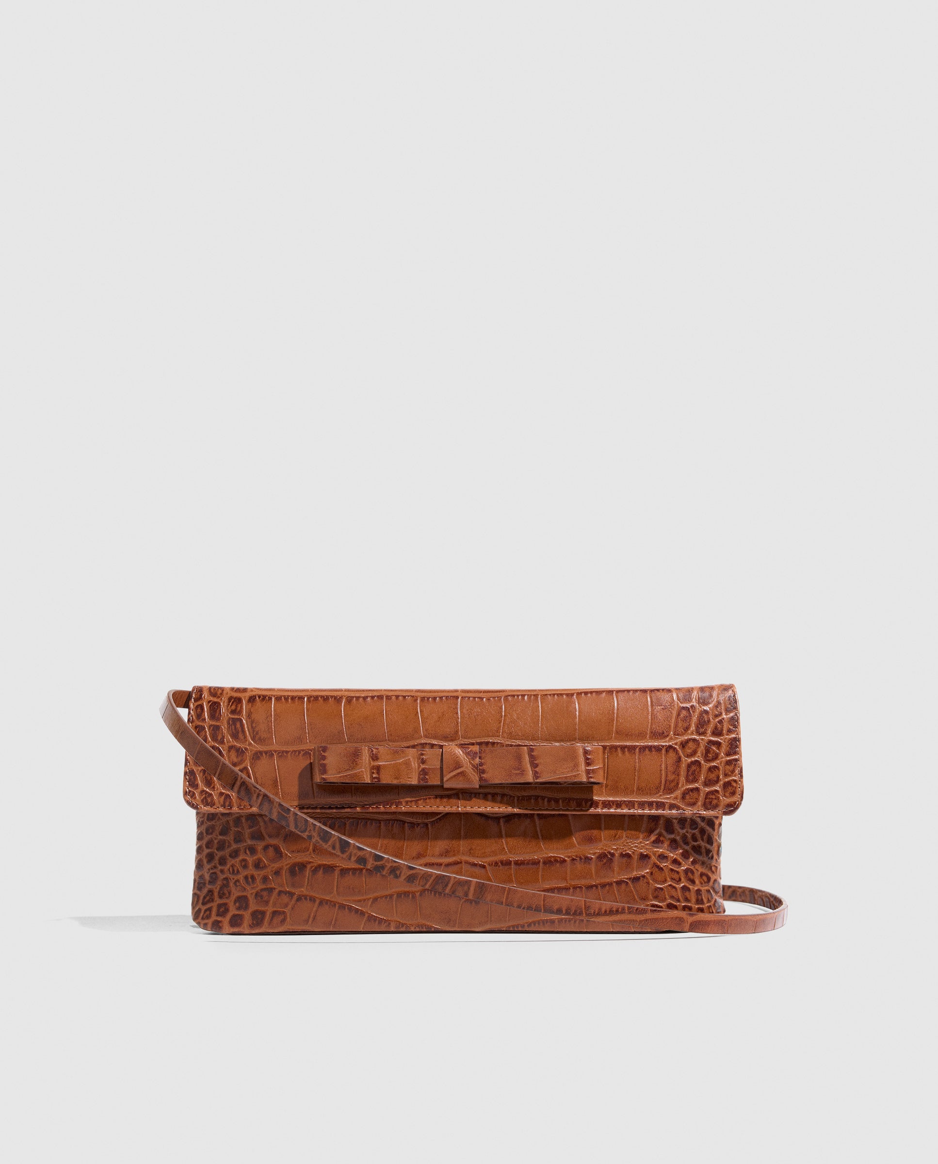 - Lazo central y solapa en piel efecto coco camel.