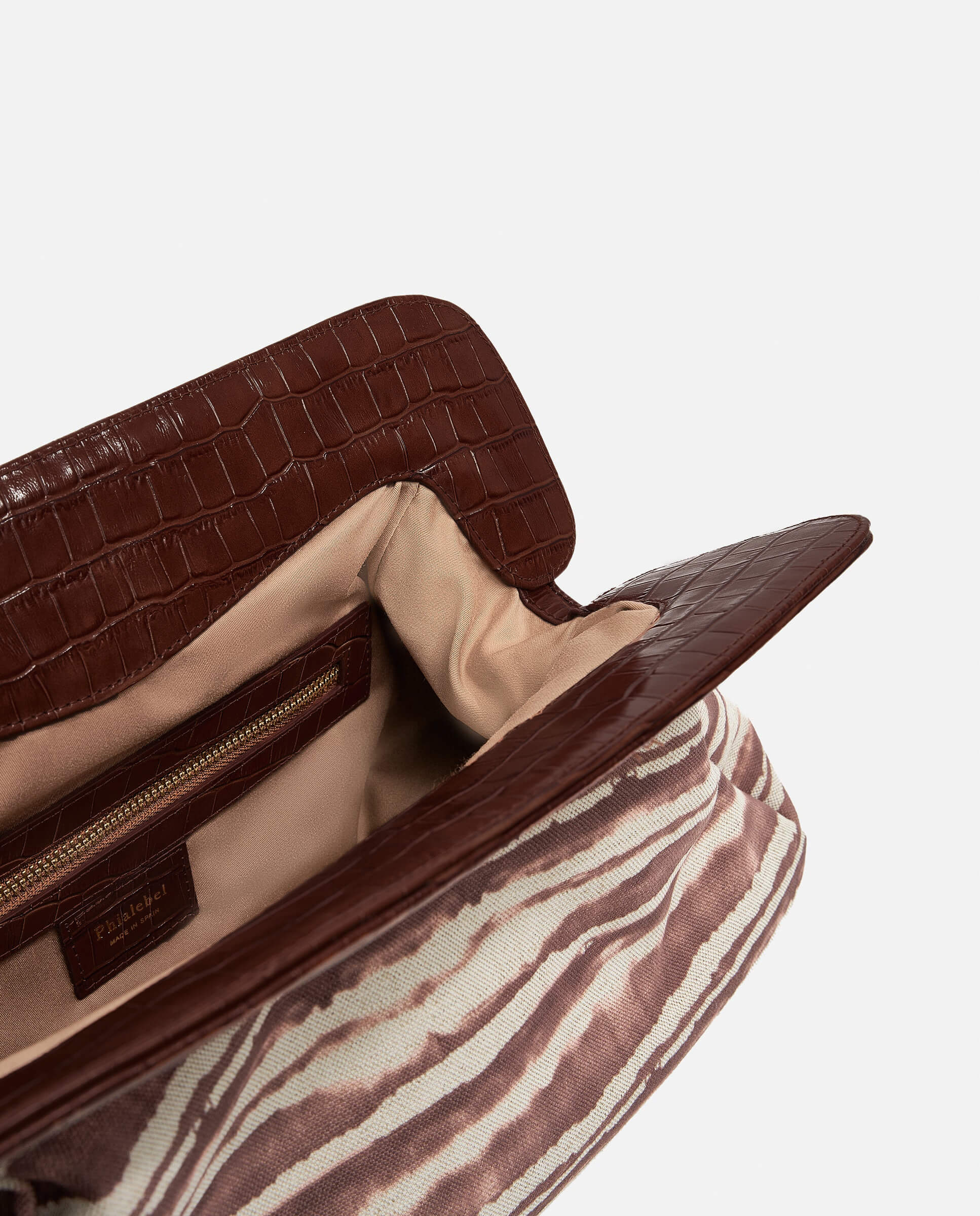 Bolso de hombro con diseño cebra marrón, femenino y versátil, con el logotipo de Phialebel en la solapa.