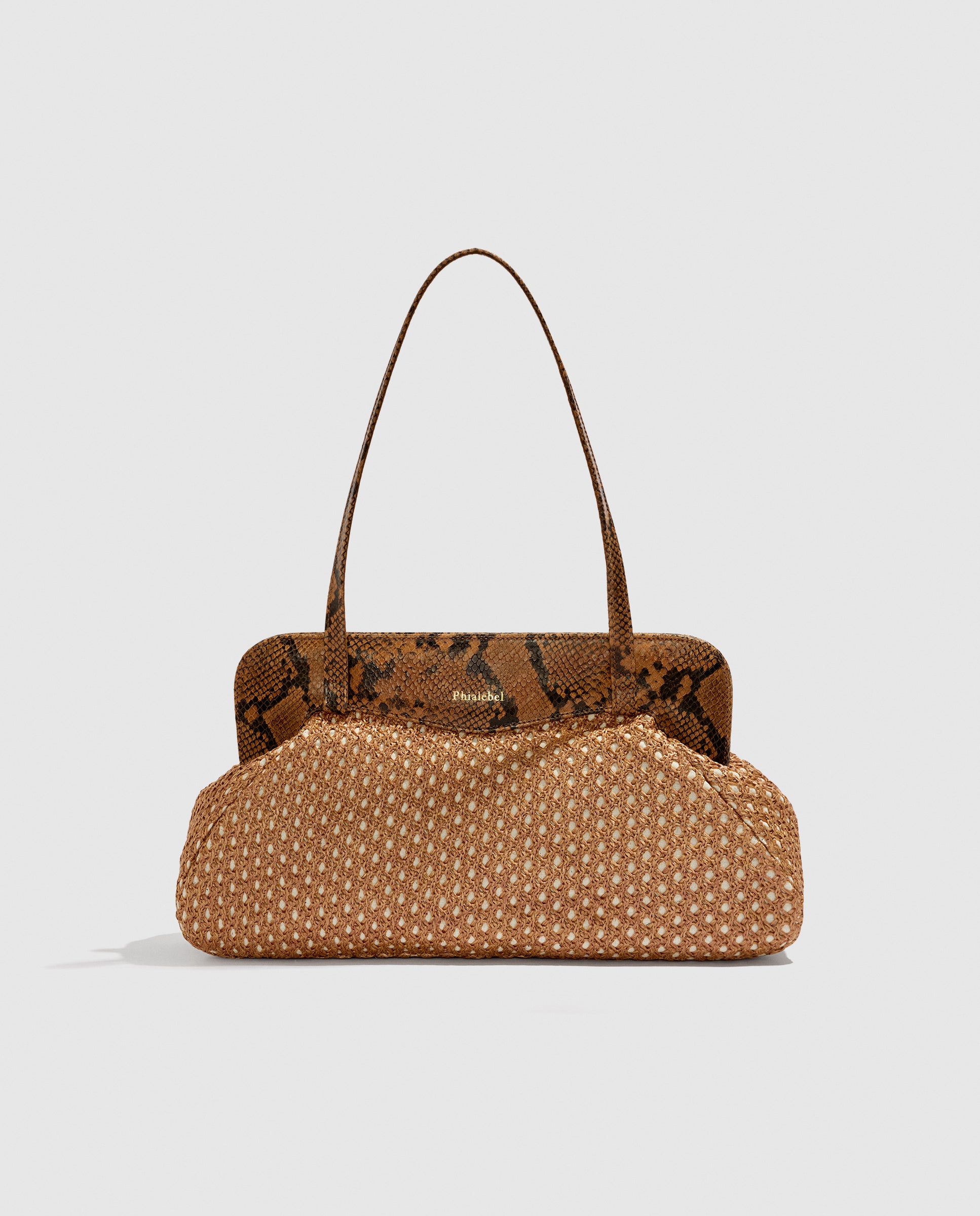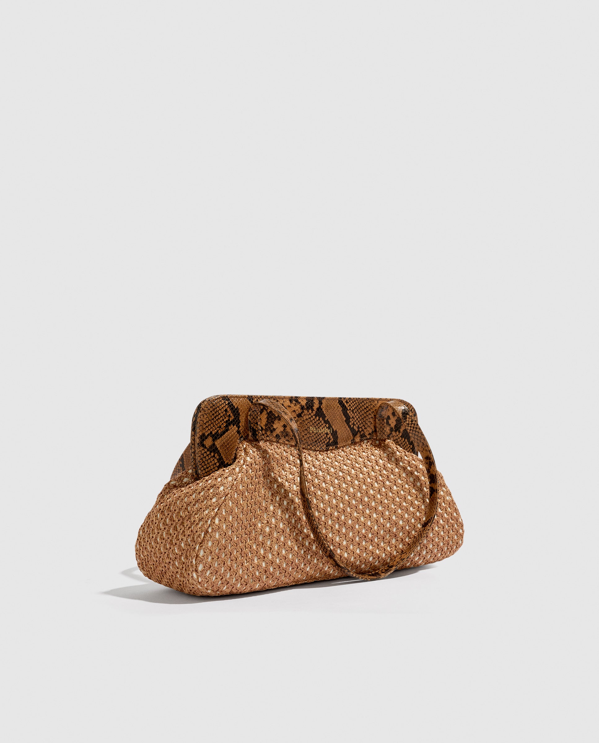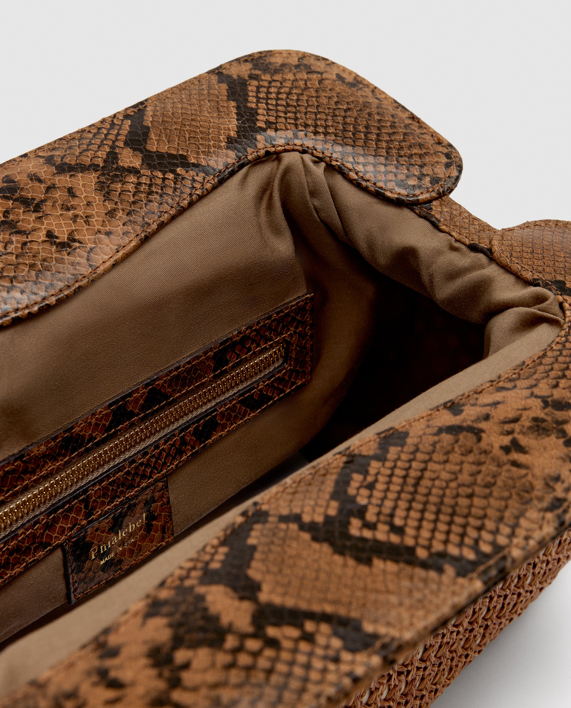 - Fabricado en rafia beige con boquilla en piel bovina camel con grabado en serpiente.